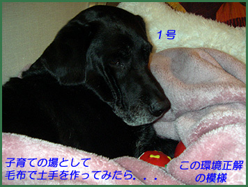 1号ちゃんを呼び寄せてベッドの上に毛布で土手を作ってあげたら